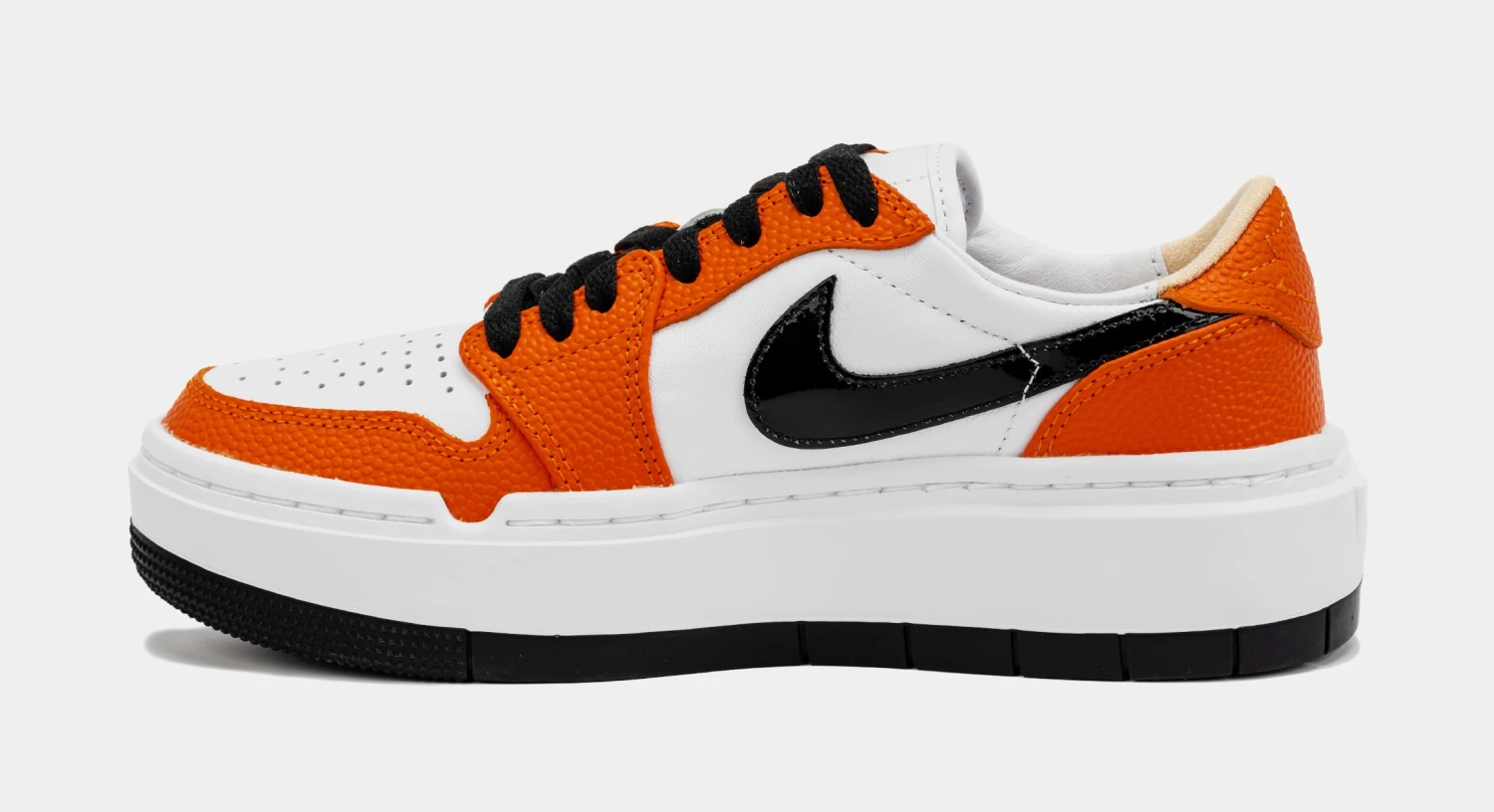 Dressed in a Brilliant Orange, Black, and White color scheme. This offering of the Air Jordan 1 Elevate Low features a White leather base with Brilliant Orange basketball-textile leather overlays and heels with Black patent leather Swooshes on each side. Its signature modified chunky platform sole in White with Black underfoot with the outline of the Wings logo on the heels and special graphic insoles completes the design