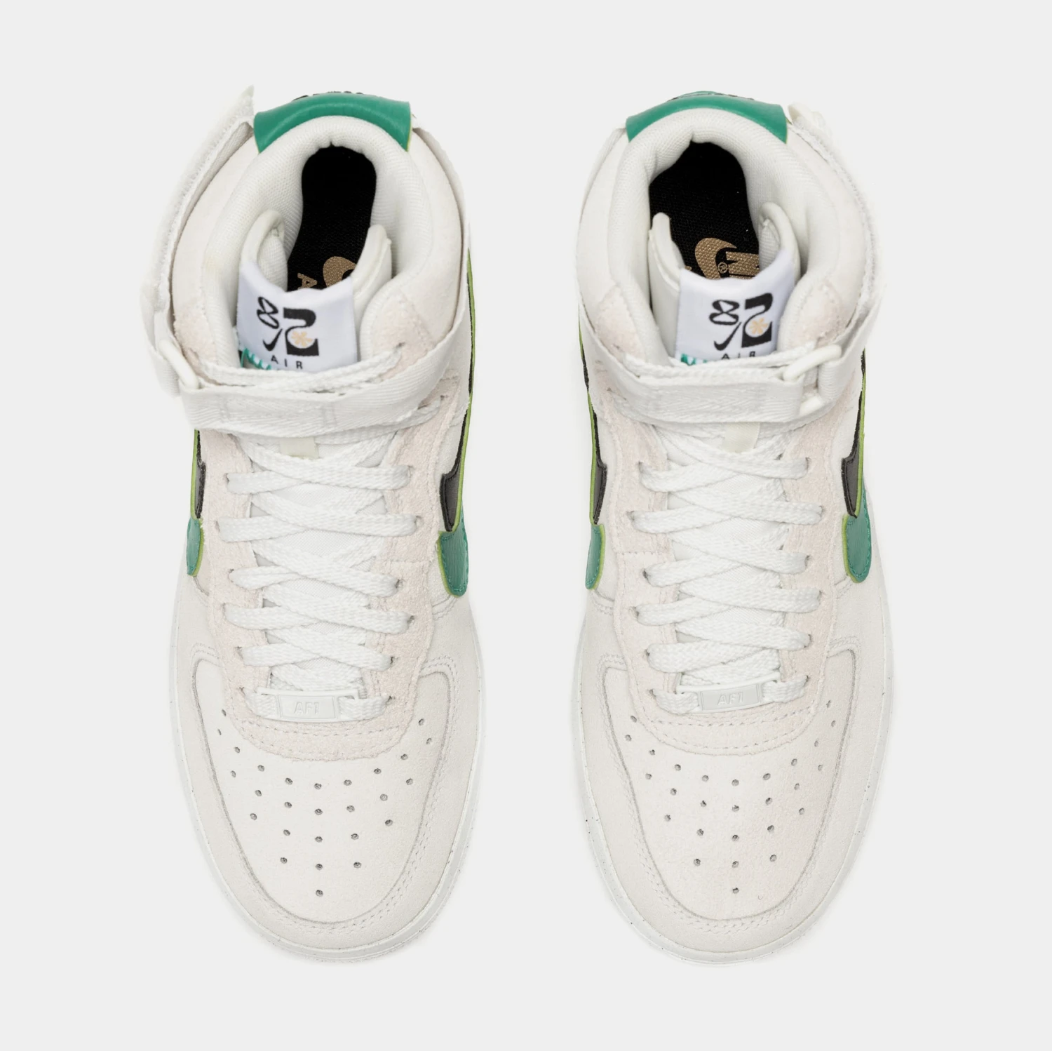 Dressed in a Summit White, Neptune Green, Black, and Sesame color scheme. This offering of the Nike Air Force 1 High comes constructed in a mix of suede, leather, and mesh materials. It features “82” branded tongue tags, double Swooshes on the sides atop a Grind Rubber AF1 sole to complete the design