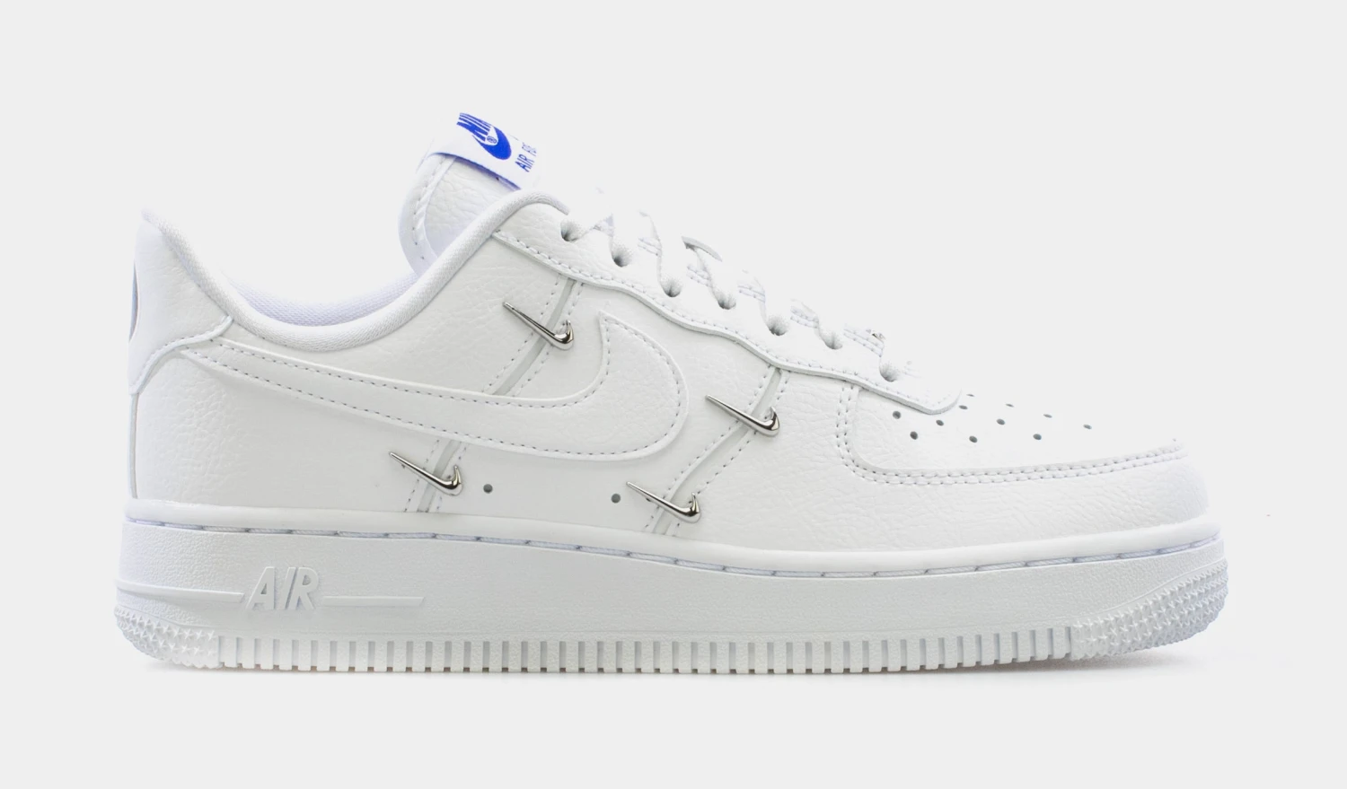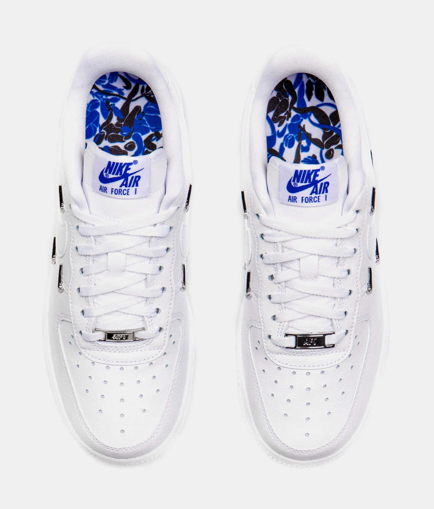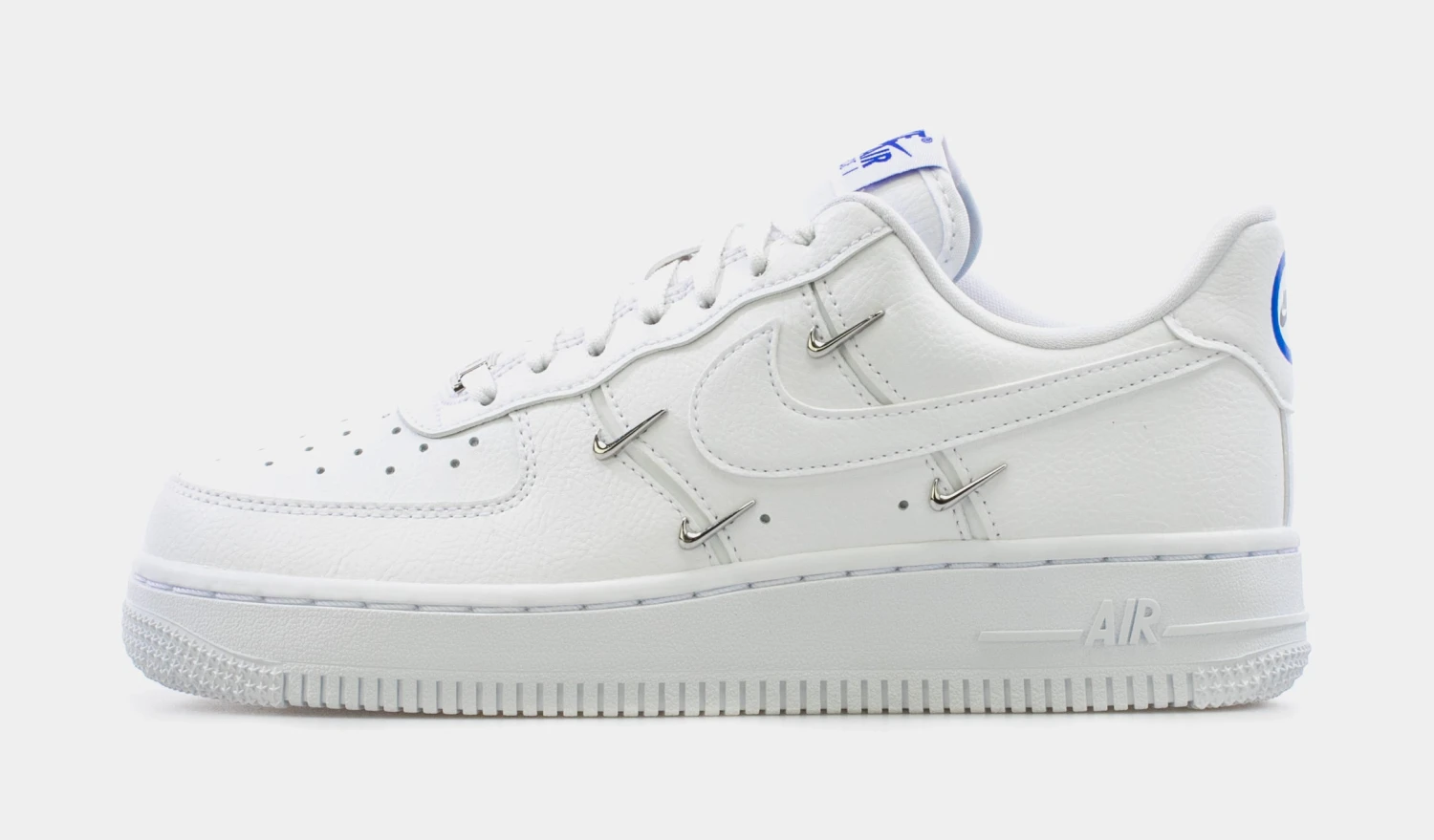 This Nike Air Force 1 Low comes dressed in a White, Hyper Royal and Black color combination. Utilizing White tumbled leather across the upper while eight Chrome Swooshes, four on each side of the panel is used. Following we have Blue on the branding located on the tongue and heel while a graphic on the insole and White on the midsole and rubber outsole finishes the look.
