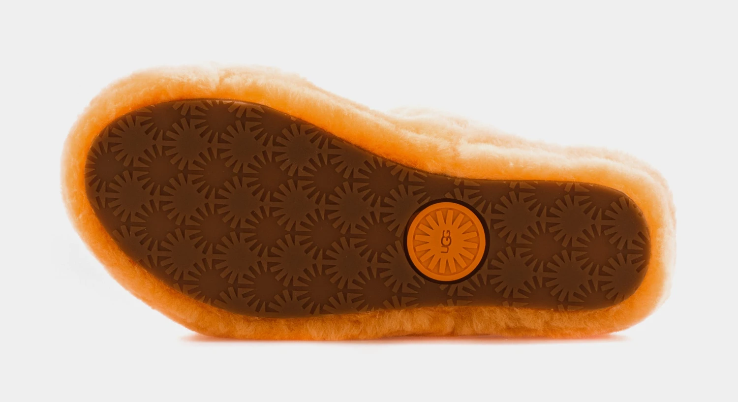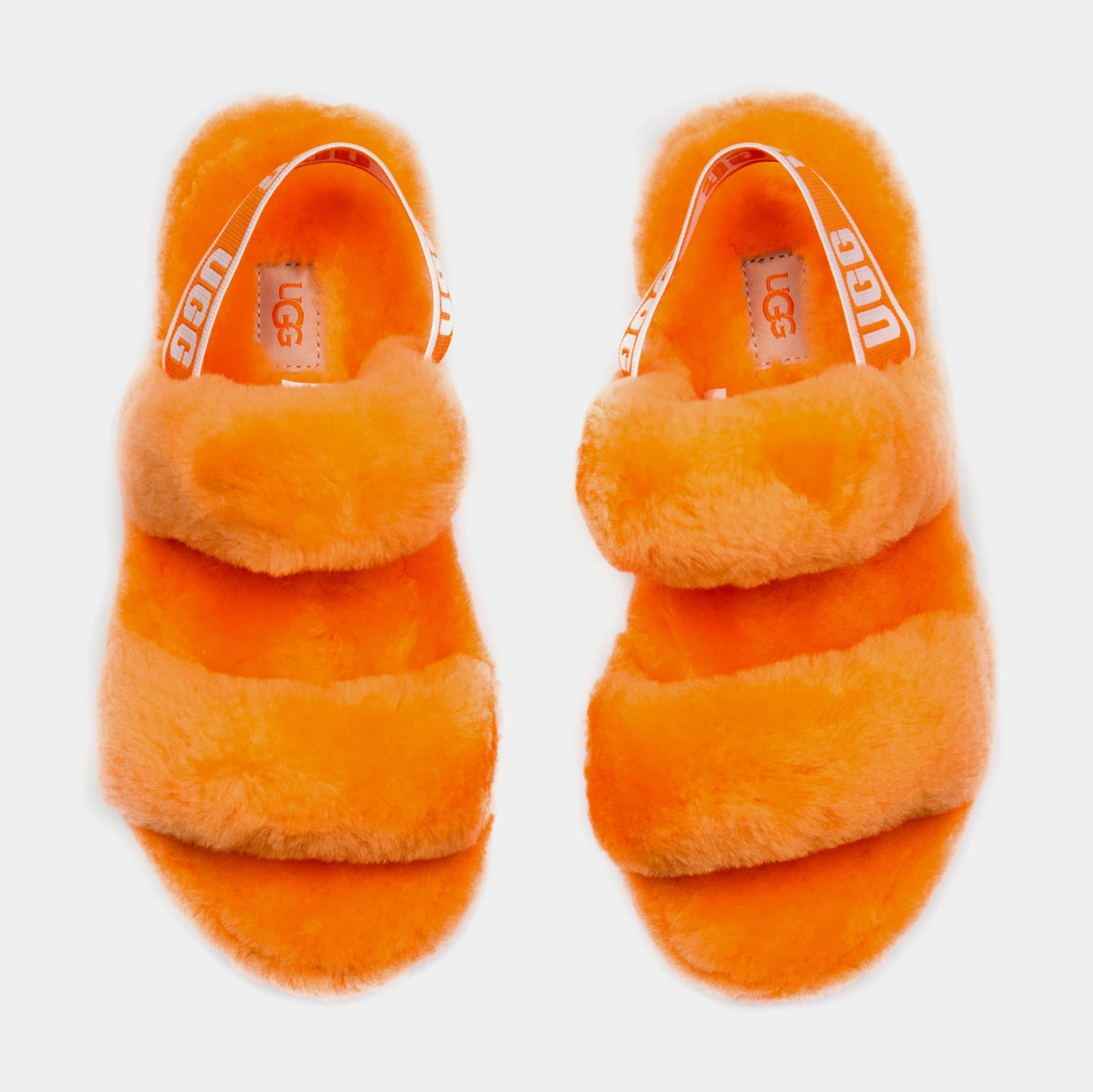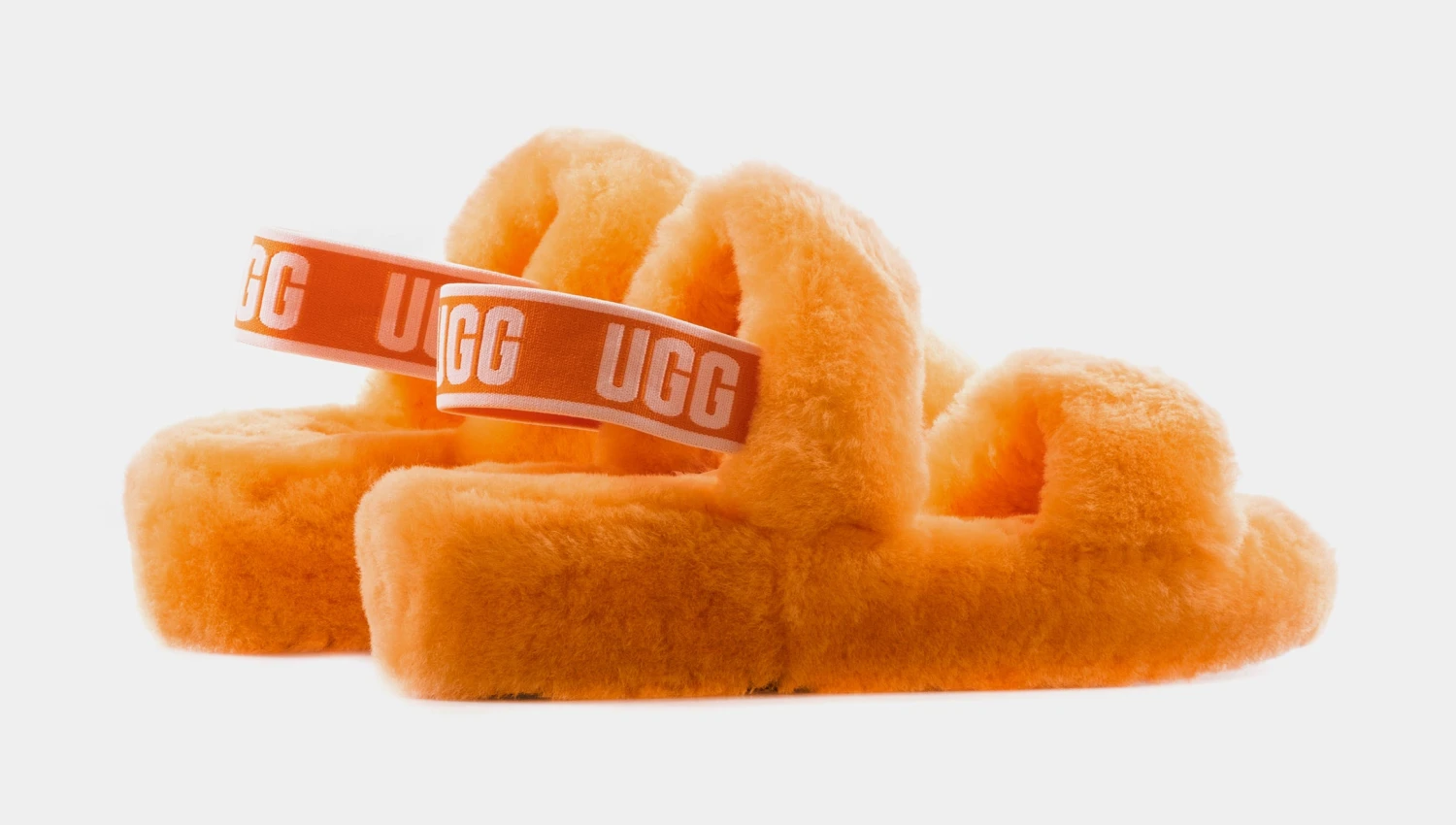 The Ugg Oh Yeah slippers are inspired and evolved from the iconic Fluff Yeah slides. Featuring a orange and white colorway, a trendy strappy silhouette, elastic strap with a repeated Ugg graphic, soft sheepskin material, molded rubber outsole, 1.5 inch platform height, and a woven Ugg logo along the insole to complete the look.