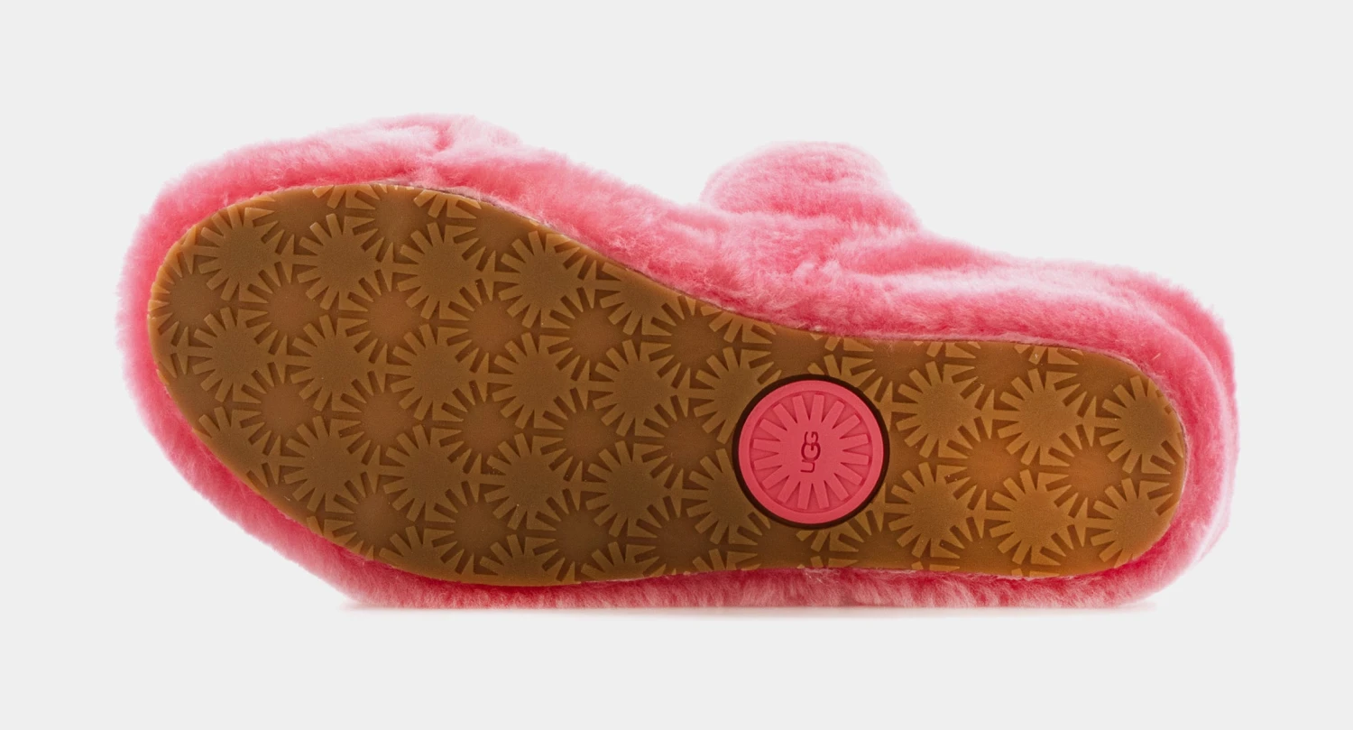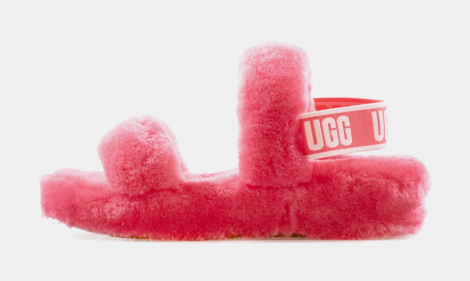 The Ugg Oh Yeah slippers are inspired and evolved from the iconic Fluff Yeah slides. Featuring a orange and white colorway, a trendy strappy silhouette, elastic strap with a repeated Ugg graphic, soft sheepskin material, molded rubber outsole, 1.5 inch platform height, and a woven Ugg logo along the insole to complete the look.